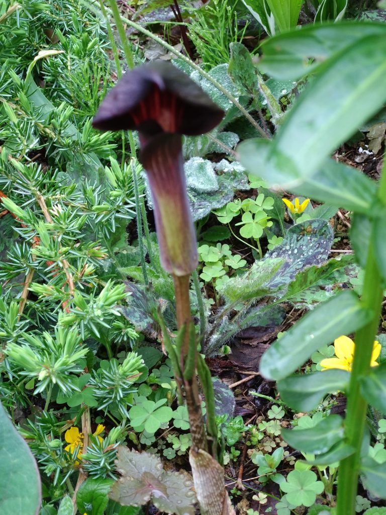 テンナンショウの中でも黒花は非常に珍しい何年もこのままでだ、普通は球根の回りに子供ができるがいっさいつかない、ふやすことができない!