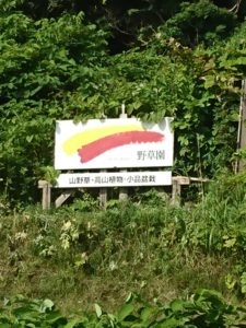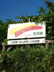 今まで道路沿いに立てていた「高山植物」「山野草」などの旗は、風で破けてしまうので、木製の看板にしました。